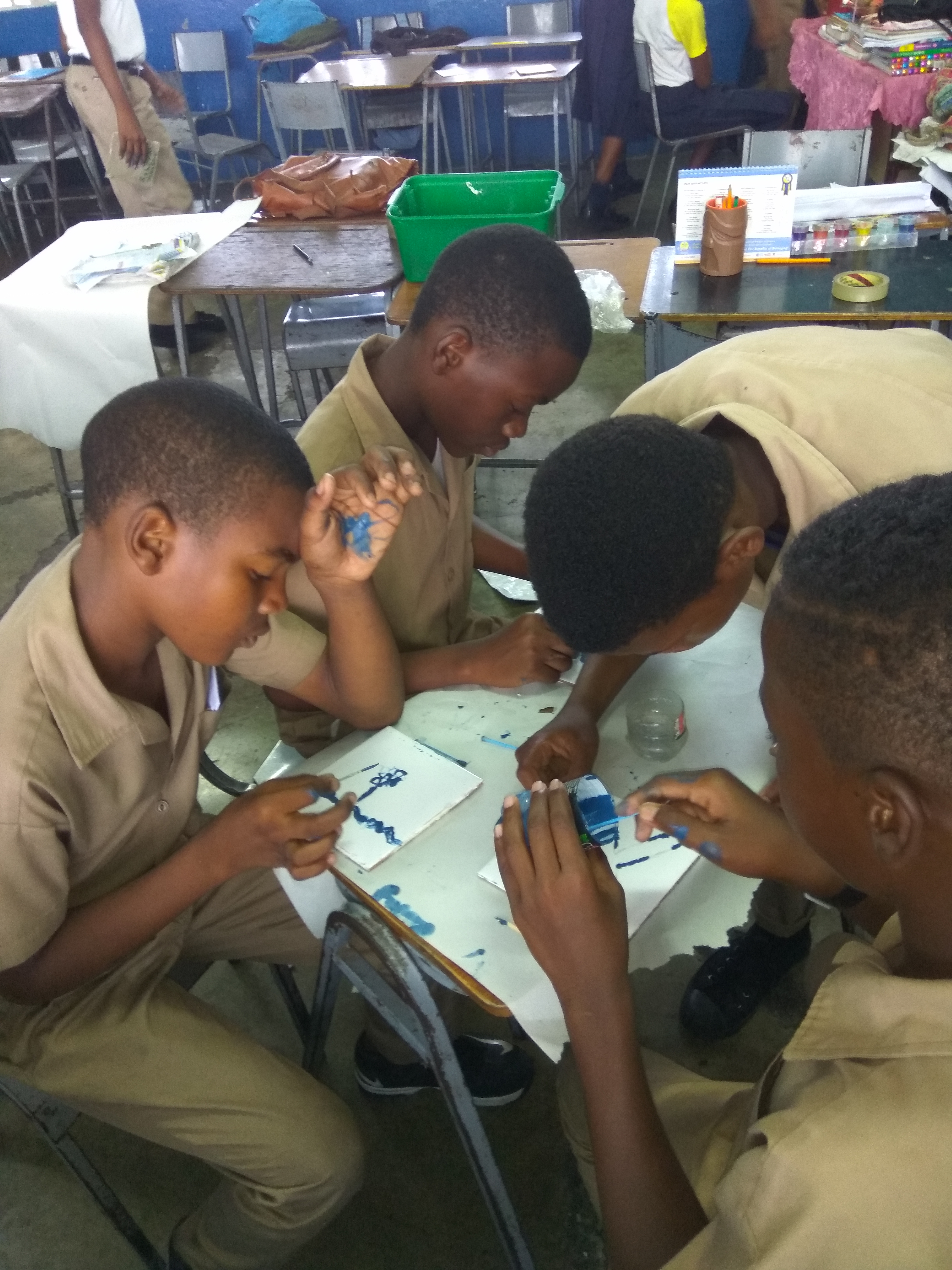 Students work hard on their tiles coming up to the exhibition of works of art and craft made by the 2017 outgoing Grade 6 under the supervision of Mrs Nadine Bonner – Williams and Anthea McGibbon with Mr McLean and Mrs Walcott assisting. The exhibition was held July 3, 2017 in the school’s canteen. Mrs Nadine Bonner-Williams in collaboration with Anthea McGibbon of OAaSIS International led Grade 6 students of Allman Town Primary into several projects as the Government incorporated ART in schools (STEAM). These tiles are artefacts where design and thoughts of students reflect lessons learnt by students during their tenure.
